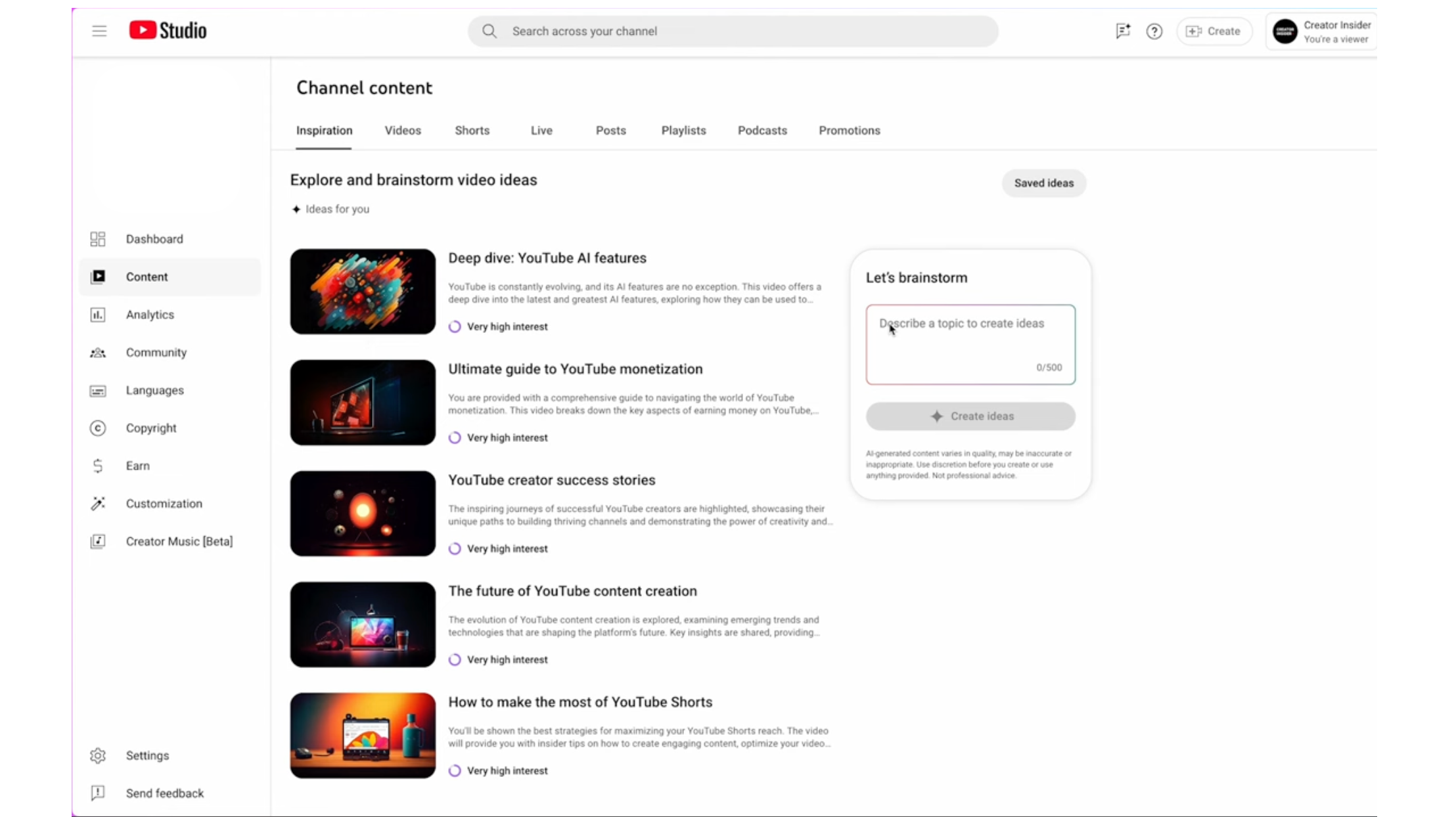 Do you have it? Head into YouTube Studio and click 'Content' in the left column. You should have a new tab at the top of your page called 'Inspiration'.